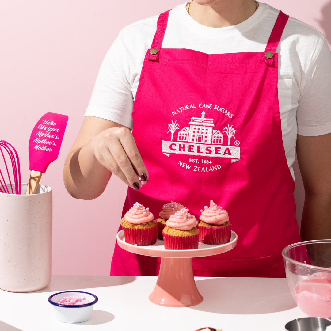 Add a pop of color to your kitchen with our Chelsea Pink Apron! Designed for adults, this apron features the iconic Chelsea Sugar logo. Keep yourself clean and stylish while baking up a storm.